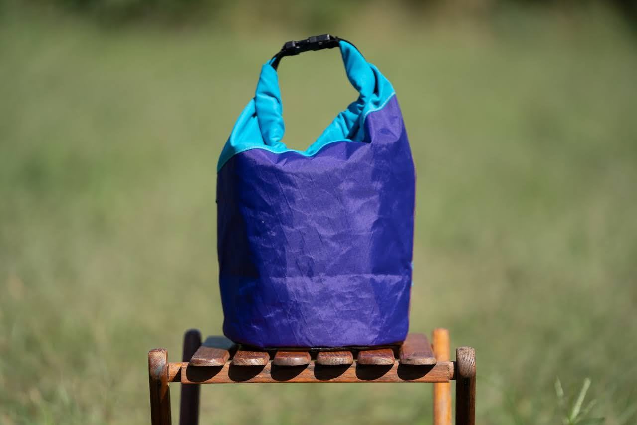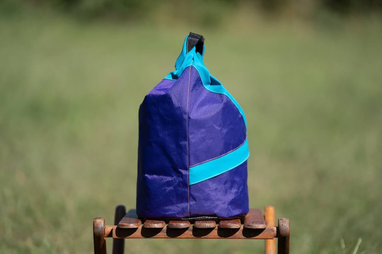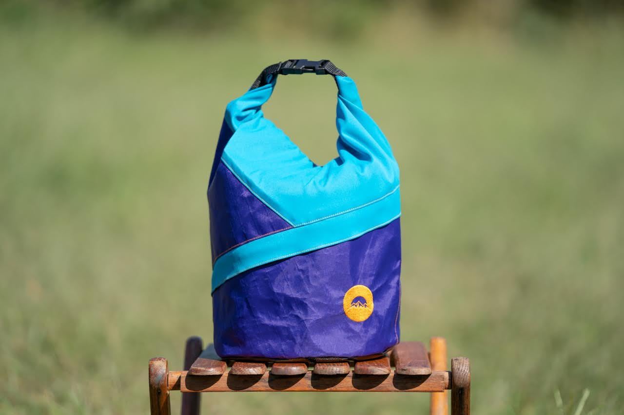 ・下部分(パープル)は高い防水性と強度を持つX-PACを、上部分(ターコイズ)は撥水加工を施したポリエステル系の素材を使用しています。