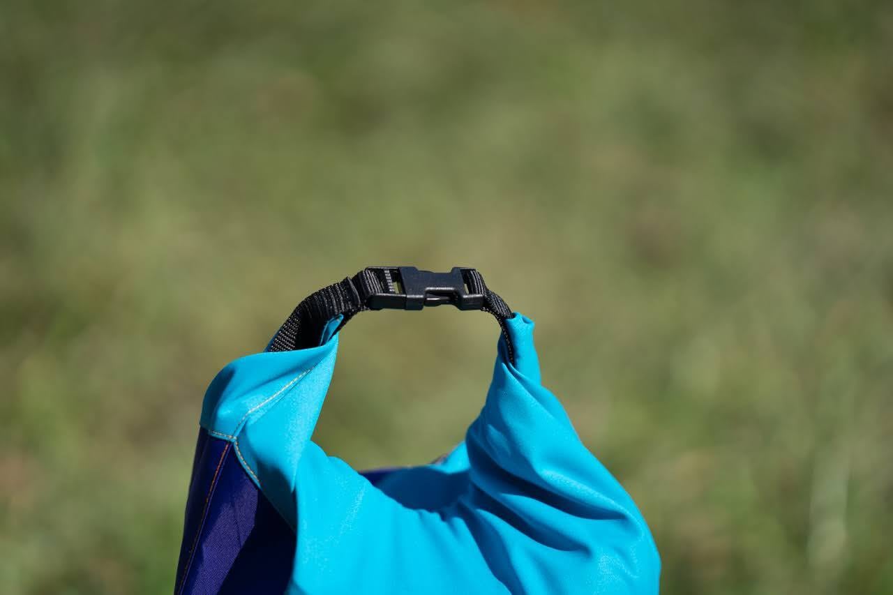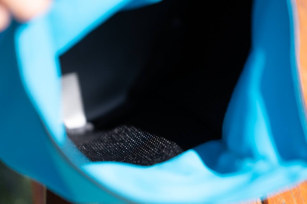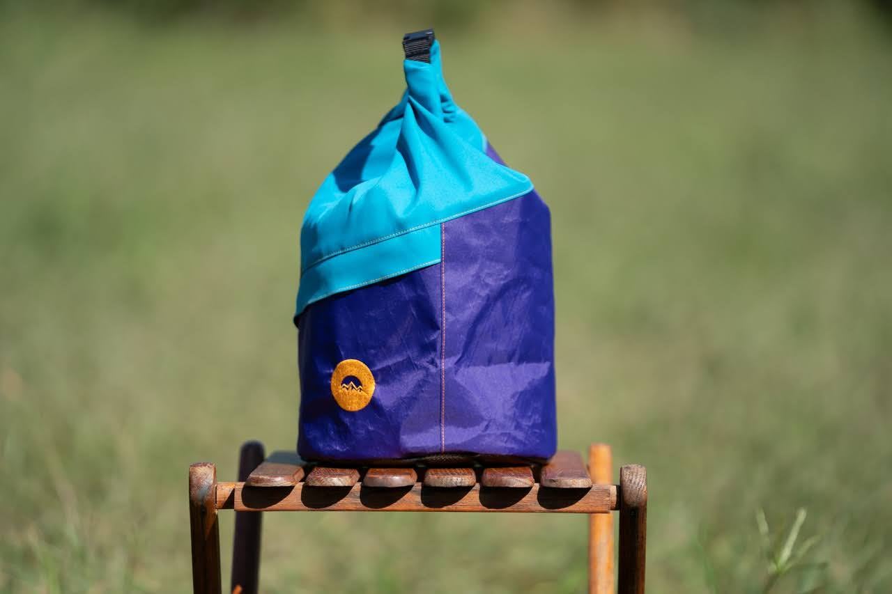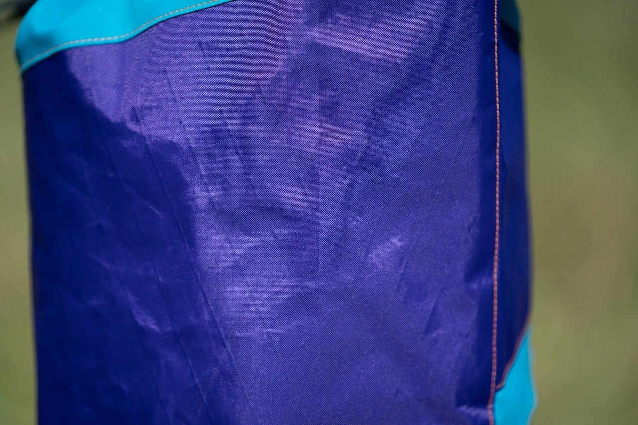 ・下部分(パープル)は高い防水性と強度を持つX-PACを、上部分(ターコイズ)は撥水加工を施したポリエステル系の素材を使用しています。