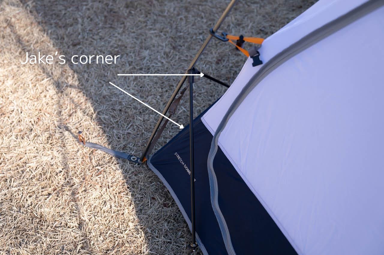 その最大の特徴は、独自のポールレイアウトが生み出す圧倒的な耐風性と、芸術的なまでに美しいシルエット。さらに、Jake’s cornerが採用されており、テント自体の強度をおおよそ40%向上、強風下でもいなすように風を逃がすその姿は、まさに機能美の極致です。