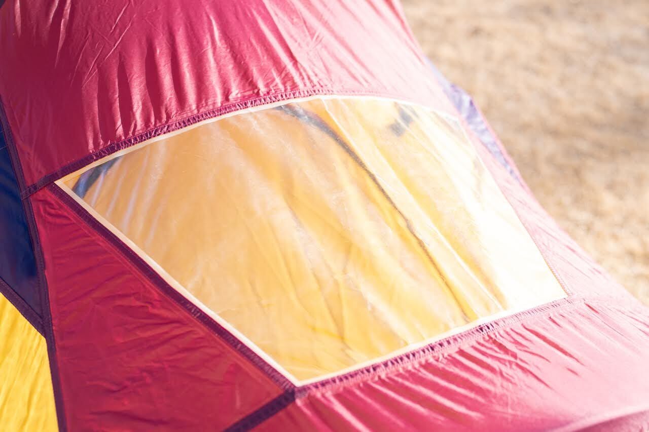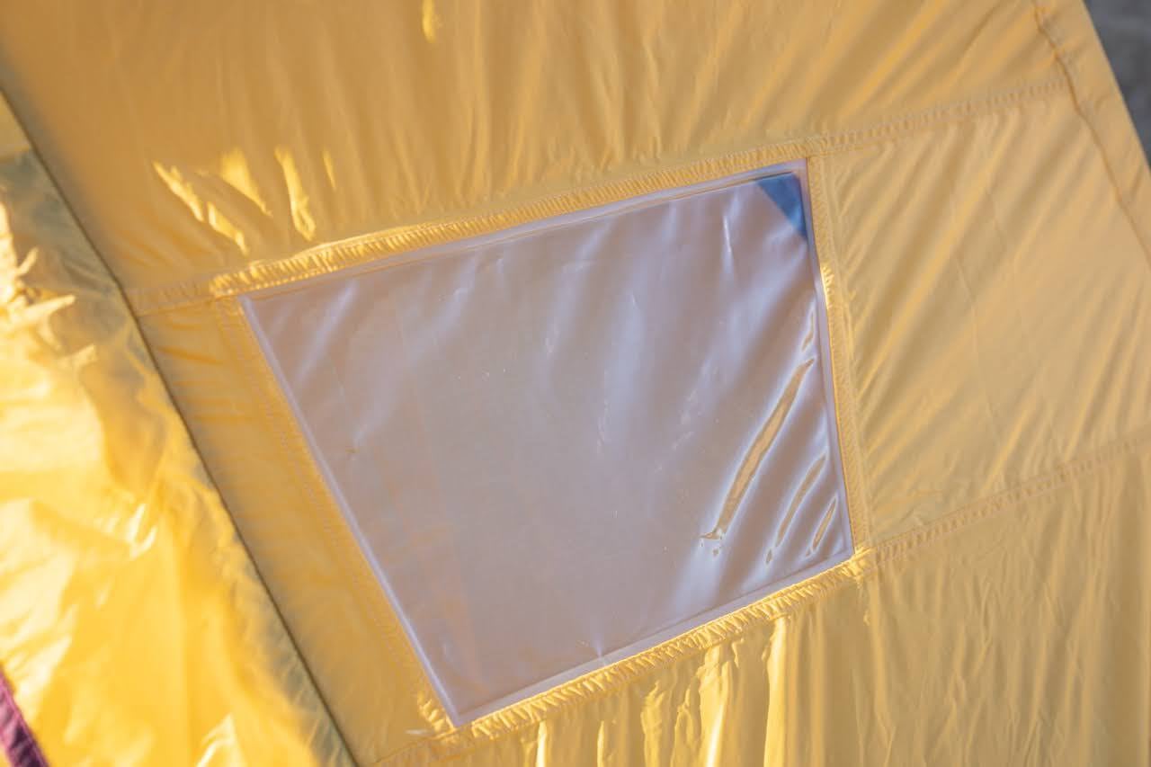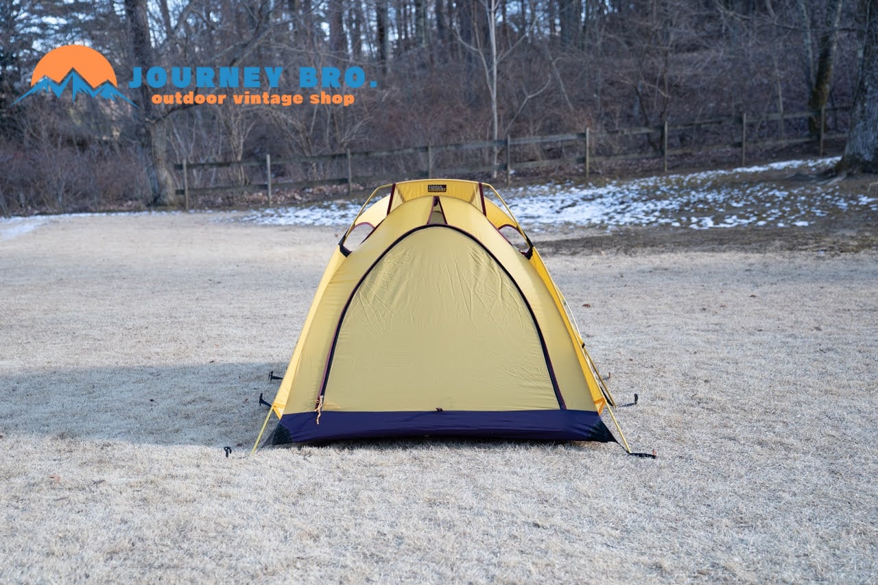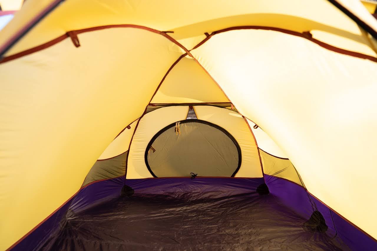インナーテントは全4本で構成(前がイエロー、後がシルバーのポール)され、圧倒的に美しいフォルム。